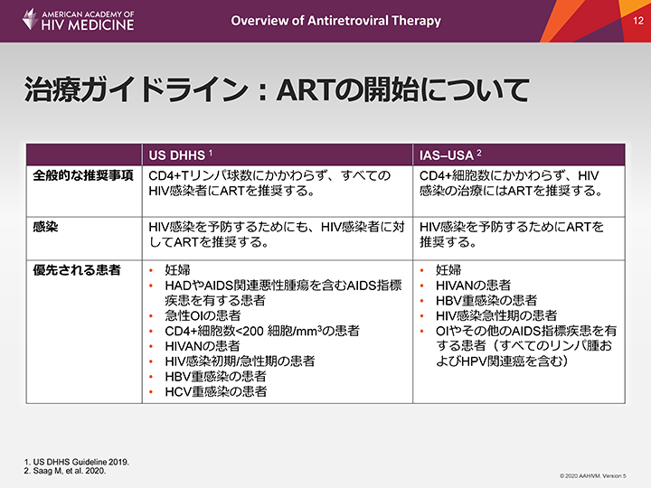 米国のDHHSガイドラインとIAS-USAガイドラインは、HIV感染症関連の罹患率と死亡率の低下のためには、CD4+細胞数にかかわらず、すべてのHIV感染者にARTの提供を推奨している。