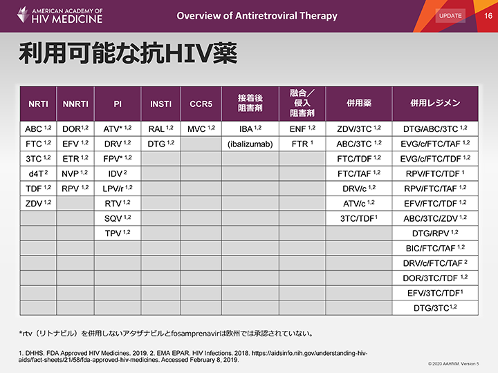 我々が利用可能な薬剤には、核酸(ヌクレオシド)系逆転写酵素阻害剤、非核酸系逆転写酵素阻害剤、プロテアーゼ阻害剤、インテグラーゼ阻害剤、CCR5受容体阻害剤1剤、点滴静注用の接着後阻害剤のイバリズマブがあることを示している。