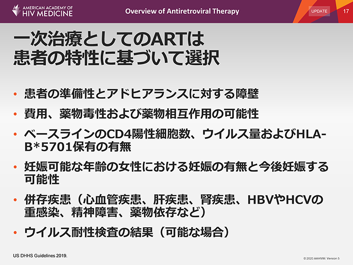 一次治療に使用される抗HIV薬の検討の際には、患者の特性に基づいて選択しなければならない。非常に重要な点の1つとして、評価の際には患者の準備性が非常に重要である。近年、ARTは即時開始する方向に移行しつつあるが、ここでもまた、患者がARTを開始できる状態であるかの確認が重要である。準備ができていない場合は、アドヒアランスの障壁となっているものは何か、障壁は何か、なぜ患者はARTを開始したくないのかを明らかにする必要がある。また、費用や潜在的な薬物毒性を考慮し、さらに、薬物相互作用もつねに考慮する必要がある。現在、患者は何を服用しているのか、これには、潜在的に相互作用の可能性のある処方薬および市販薬、ハーブサプリメント、ビタミン剤などが含まれる。