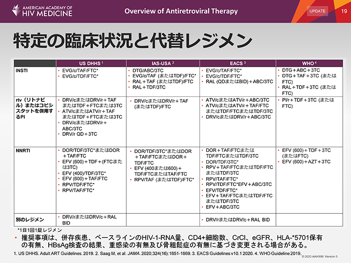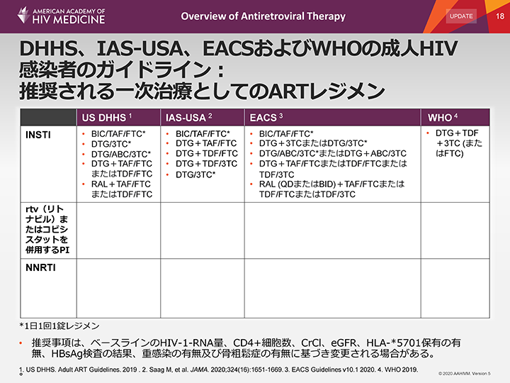 欧州、DHHS、IAS-USA、WHOのガイドラインも、ARTレジメンに関する推奨は類似しており、INSTI+NRTIバックボーンを支持している。これらの併用レジメンは、いずれも有効であることが示されている。しかし、それぞれの抗HIV薬およびレジメンによって、薬物動態プロファイル、薬物相互作用、副作用および毒性が異なることに注意しなければならない。一部の一次治療としてのレジメンは、1日1回1錠レジメンとして処方されている。
