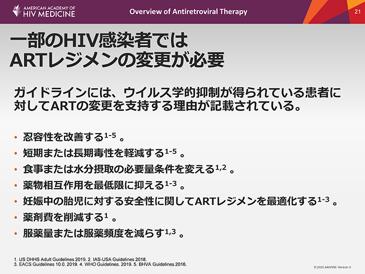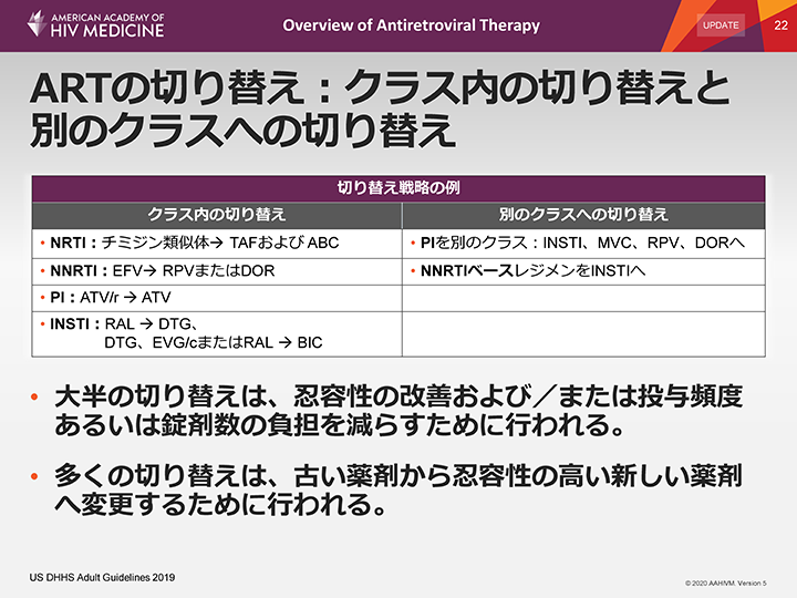 治療ガイドラインによると、現在のレジメンでウイルス学的に抑制されている患者に対する治療の切り替えに関して考慮される理由には下記が含まれる: