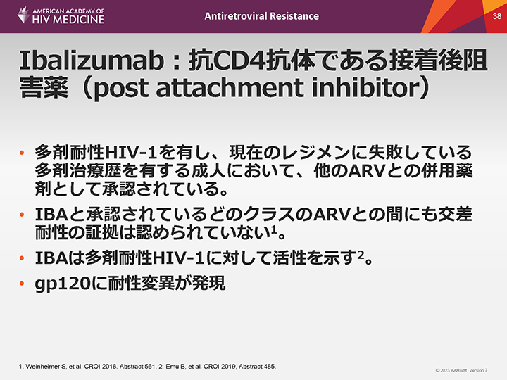 Ibalizumab(IBA)はCD4に結合し、CD4+T細胞へのHIVの侵入を阻害する接着後阻害薬である。正常な免疫機能を保っているCD4+T細胞へのHIV感染を防ぎ、様々な臨床分離株に対して強力な活性を示し、既存のARVとの交差耐性の証拠は認められていない。